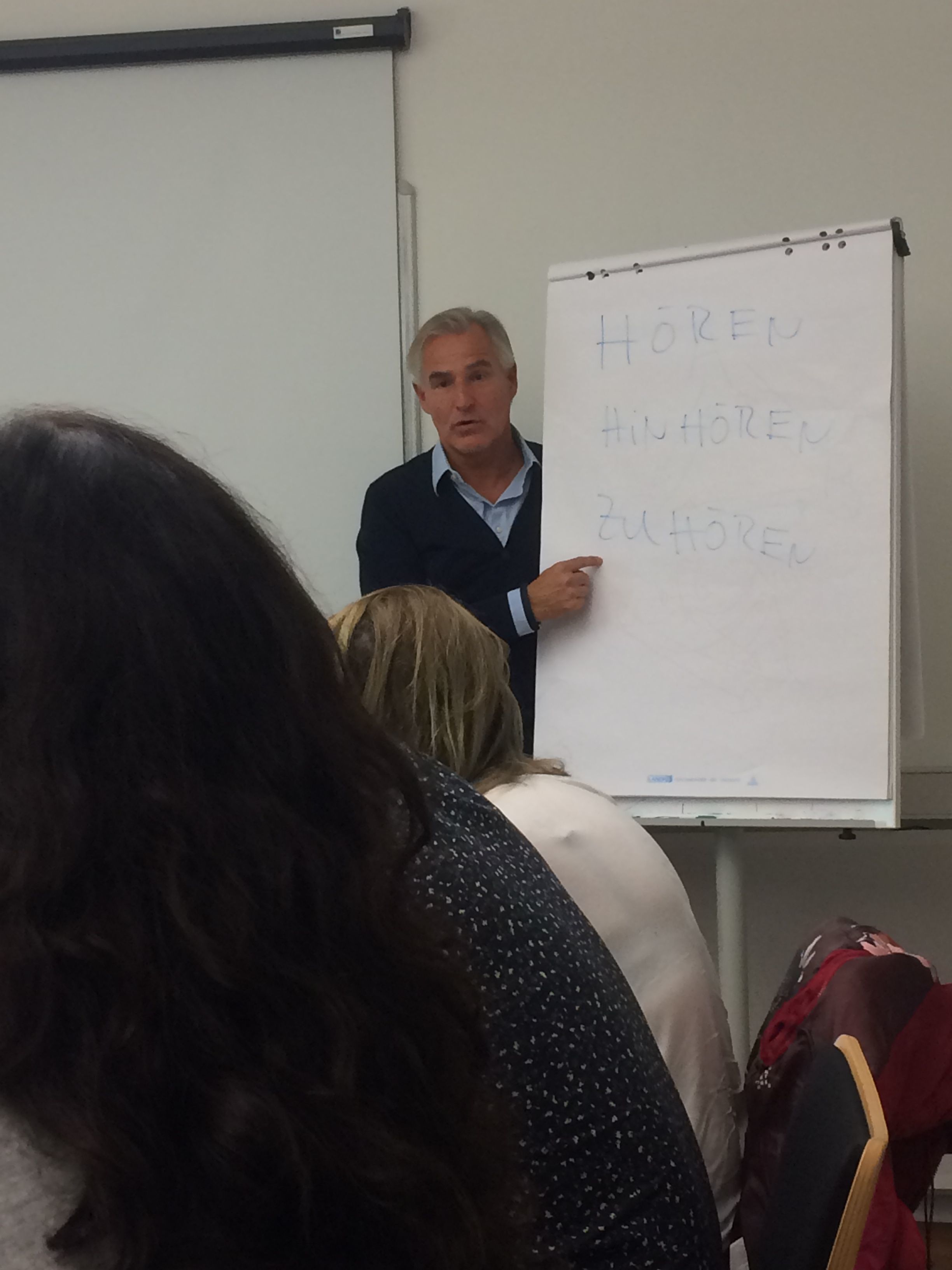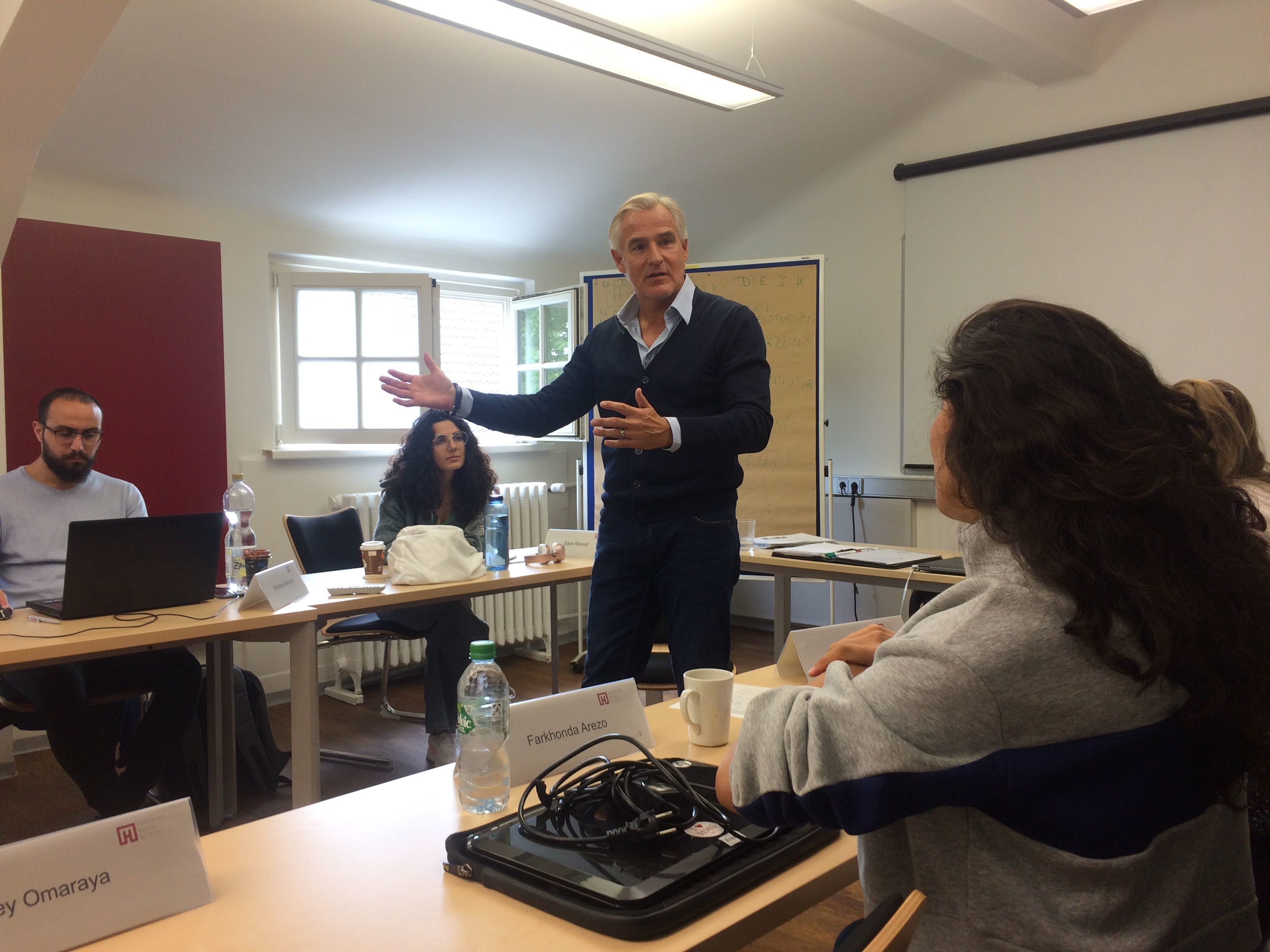 Genau dafür steht Karsten Linke heute vor den zehn Teilnehmern. Linke, oder auch Karsten, wie alle in dem Kurs ihn sogleich nennen dürfen, ist ausgebildeter Journalist, Sportkommentator Moderator und auch Coach. In dieser Funktion arbeitet er regelmäßig mit seinen Kunden an kompetentem Auftreten, daran, sich perfekt zu präsentieren, öffentliche Auftritte zu meistern oder beispielsweise in Interviews zu überzeugen – alles Kompetenzen, die für die Teilnehmer und ihre beruflichen Ziele extrem wichtig sind. Und die genau die Bereiche betreffen, in denen sie sich – nun nicht mehr in ihrer gewohnten kulturellen Umgebung und zudem noch außerhalb ihrer Muttersprache – noch unsicher fühlen.