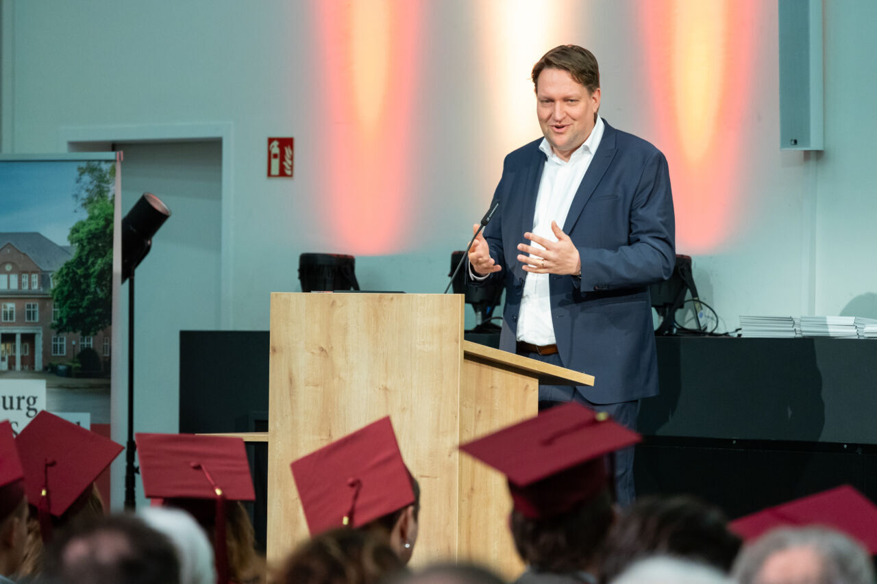 Dr. Christian Heise, Präsident der Hamburg Media School, eröffnete die Veranstaltung und würdigte die besondere Leistung der Studierenden. Er betonte, wie anspruchsvoll ein berufsbegleitendes Studium sei und wie beeindruckend es sei, diesen Weg trotz Job, Familie und weiteren Verpflichtungen erfolgreich zu meistern.